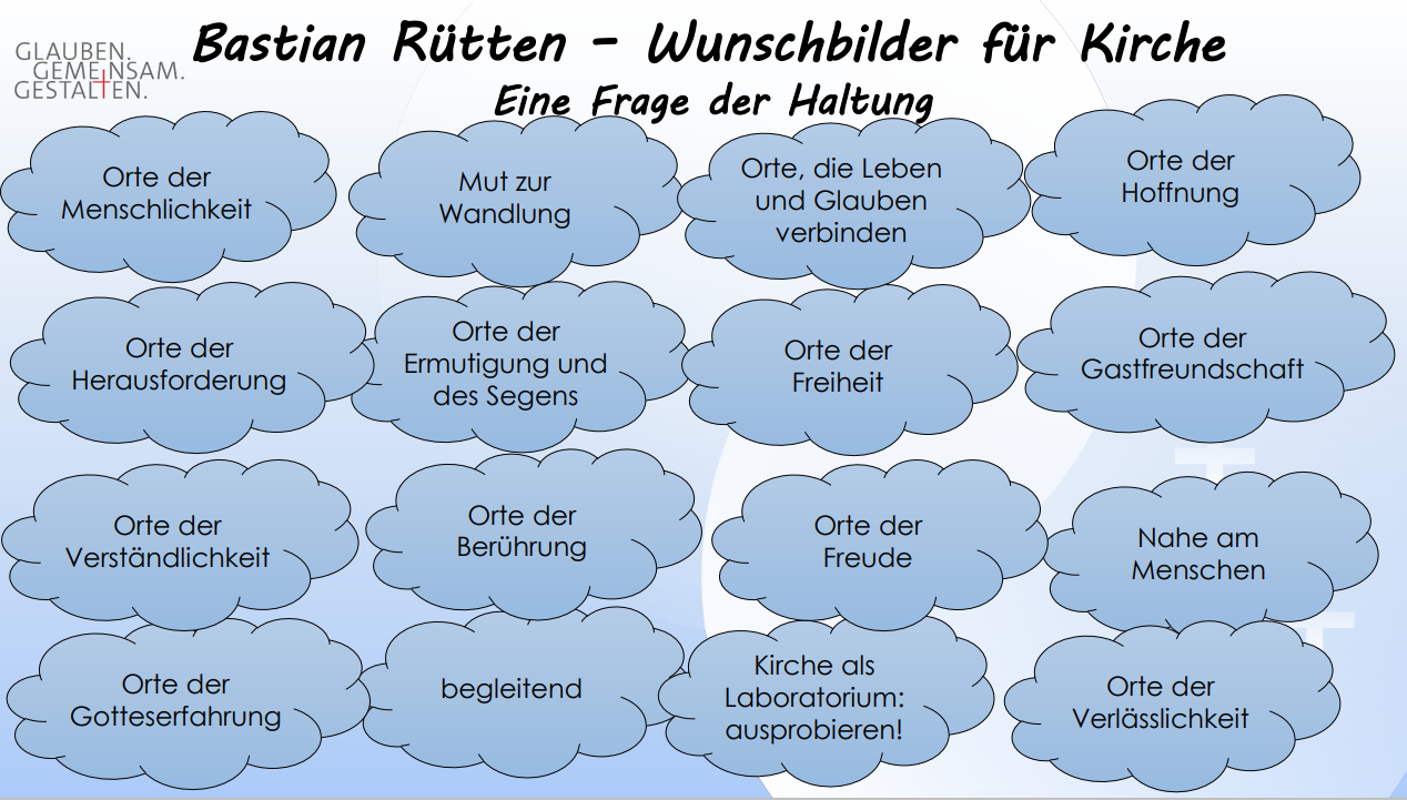Dechant Andreas Schulte hat in seinem Vortrag die wesentlichen Grundzüge des unter dem Leitwort Glaube. Gemeinsam. Gestalten. gestarteten Bistumsprozess zur Bildung der neuen Seelsorgeräume skizziert. Zudem griff er Gedanken von Bastian Rütten zu „Wunschbildern für Kirche – eine Frage der Haltung“ auf.